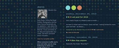 Finally decided to change my blog template after 6 long years. In fact, I had not even made any changes to the blog template for all these years - not even the background colour. So decided to make a change - cause hopefully, the new year 2011 is going to be a year of changes.